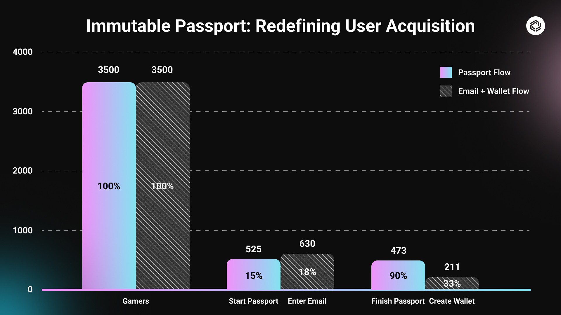 Earlier this month, we released a case study with 7,000 gamers to test our hypothesis, and the results are in. When we presented two groups with either an Immutable Passport sign-up flow, versus a traditional email and wallet creation sign-up flow, players were twice as likely to convert.