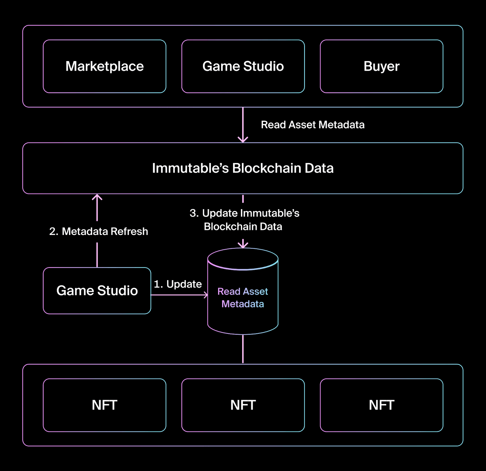 Immutable's Blockchain Data indexer is responsible for maintaining and tracking an asset's metadata. This allows for the refreshing of an asset's metadata that changes the most regularly due to gameplay mechanics as an off-chain event, without incurring additional gas fees. If an asset’s metadata is updated off-chain, calling Immutable’s Metadata Refresh function will update Immutable's Blockchain Data indexer. This enables various community members such as marketplaces, traders, or other game studios to have access to all assets within the Immutable’s ecosystem in a central, standardized location. This level of transparency contributes to a more informed and transparent ecosystem.