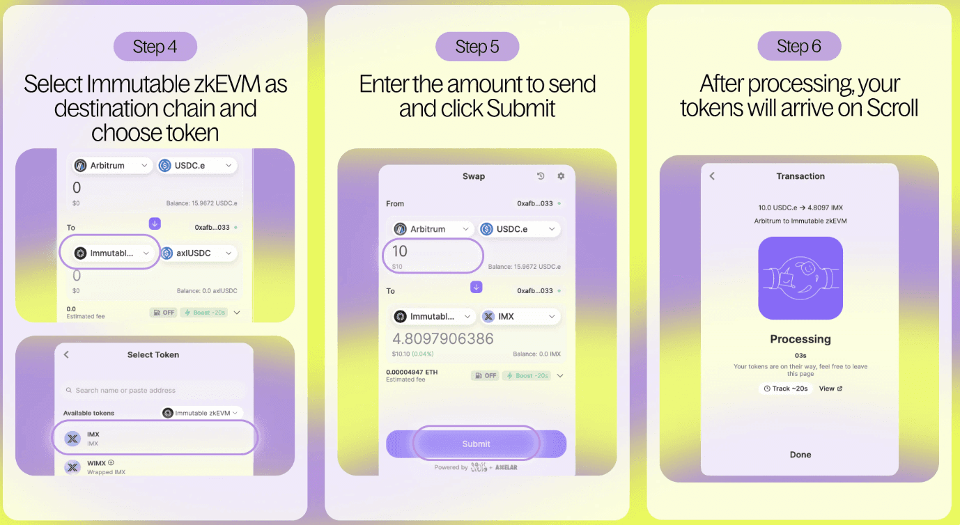 For the below example, we’ll be swapping $USDC.e from Arbitrum to $IMX on Immutable zkEVM.