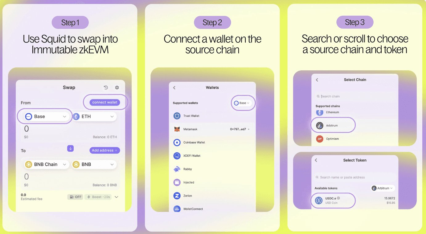 Interested in bridging to Immutable? Use Squid and directly swap directly into Immutable from any EVM or Cosmos chains! We’ve put a guide together to show you how.