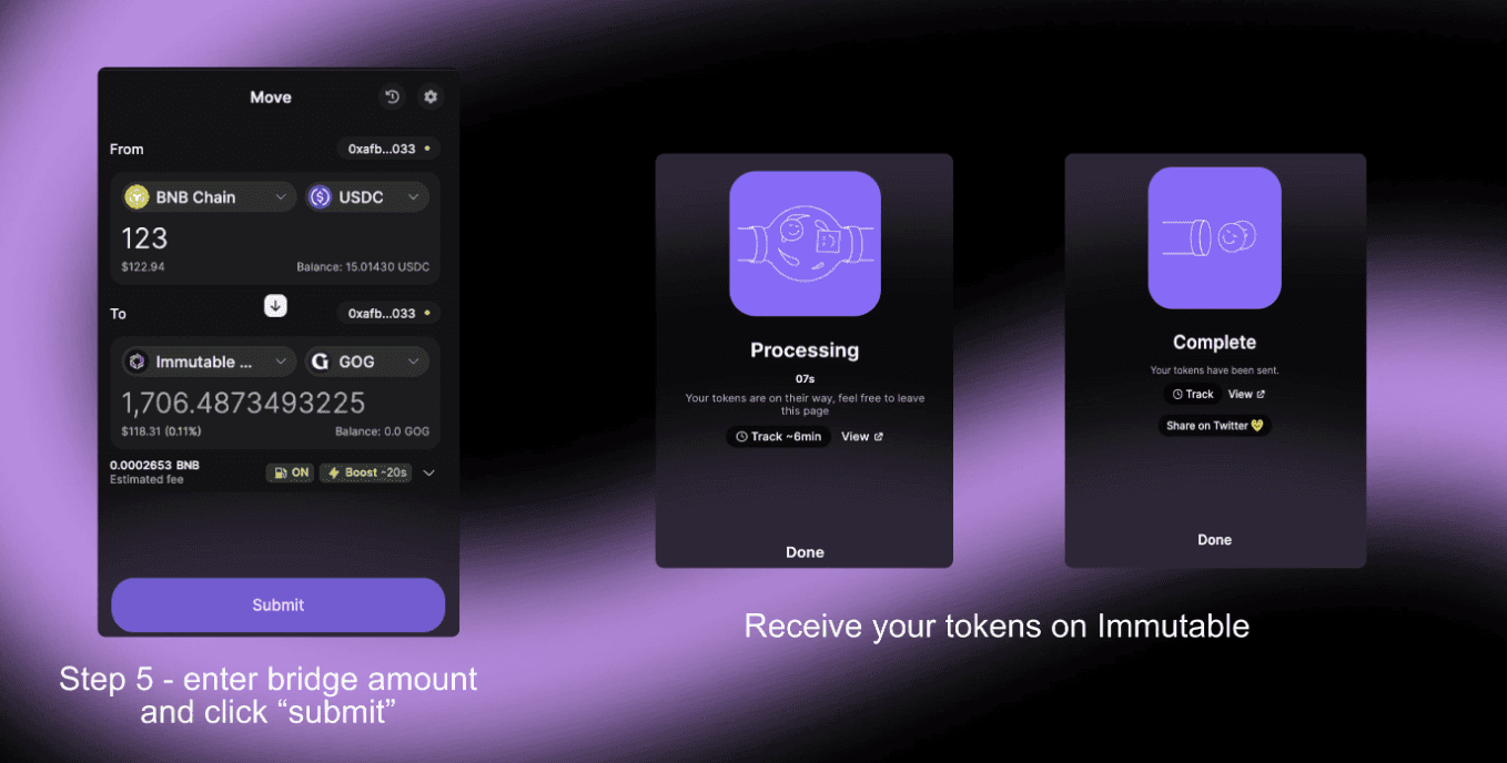 A “Complete” message will appear after your order has processed and your tokens are officially on Immutable zkEVM.