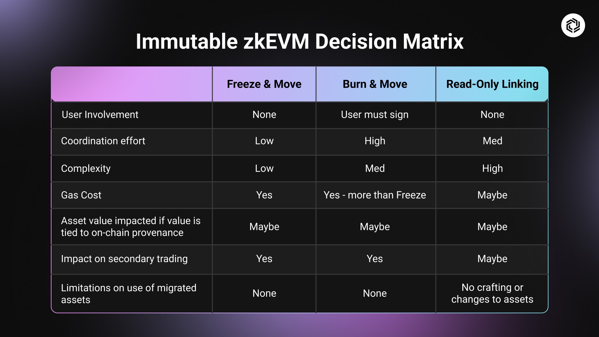 Freeze and Move: under this scenario, the game ‘copies’ the assets onto Immutable zkEVM, while freezing trading and in-game interaction/visibility of the original assets.