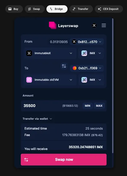 Option 2: Moving funds from Immutable X to Immutable zkEVM using Layerswap via Immutable Toolkit