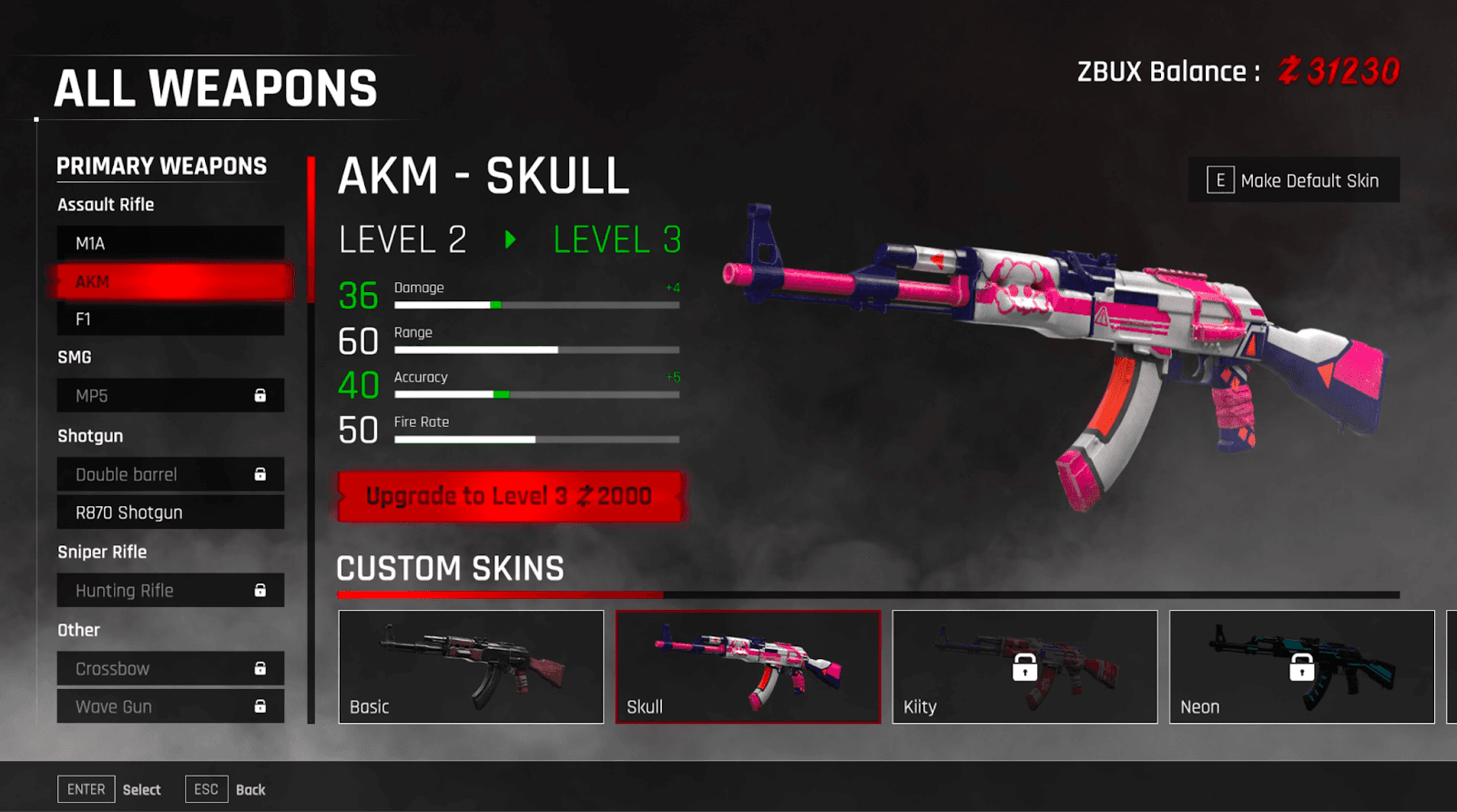Undead Blocks enables players to truly own their weapons and skins as NFTs. The game also incentivizes players to keep investing in their weapons through rewarding gameplay with their in-game token ZBUX, which can be used to upgrade weapons, trade for new weapons, or to obtain loot boxes holding in-game items.