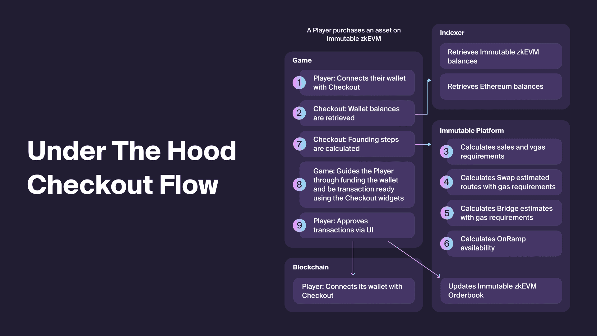 The Immutable Orderbook and Immutable zkEVM blockchains process the player's operation.