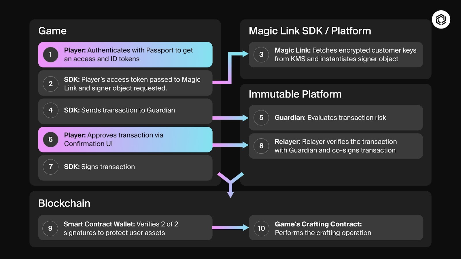 9. The player’s Passport smart contract wallet living on the Immutable zkEVM blockchain, verifies the signatures on the transaction before forwarding the transaction to the target smart contract, in this case, the game’s crafting contract.